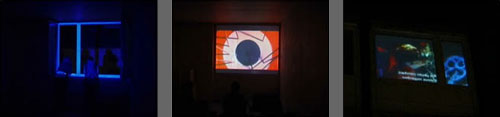 Accompagnying the intervention and during the exhibition, the artist has organised two nights of theme-oriented screenings in the form of an installation (rear-projection). Ten films where shown on one of the big window of the above mentionned building, so that the image could be seen both from inside (with seats, biers and sound) and outside (silent and reverse).
